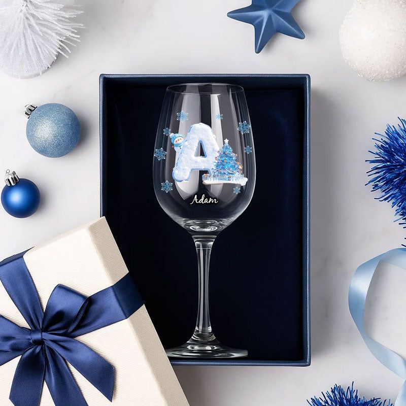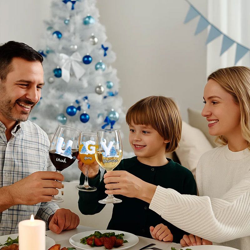 Merry Christmas - Personalized Blue Christmas Tree Long Stem Family Wine Glass
